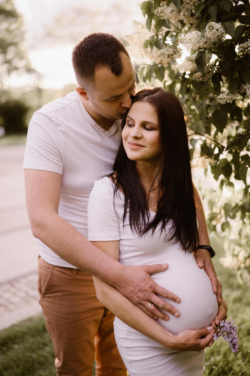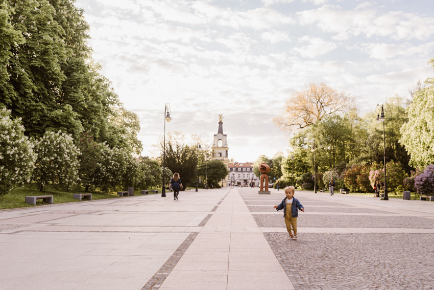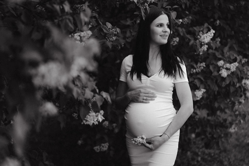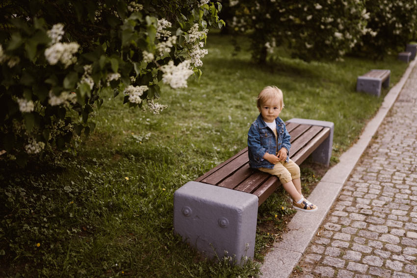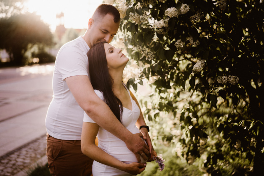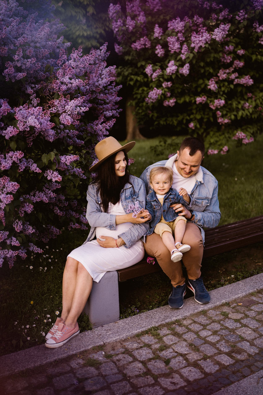Czas, w jakim wykonywaliśmy sesję, obfitował w piękne, kwitnące krzewy lilaków (potocznie zwanych bzami – i chyba pod tą nazwą większość kojarzy te fotogenicznie i wspaniale pachnące rośliny), a spacerując po Białymstoku już od jakiegoś czasu miałam wypatrzoną obłędną miejscówkę do zdjęciowego wykorzystania! Miejska sesja w centrum okazała się strzałem w dziesiątkę. Okolice Teatru Dramatycznego w Białymstoku z kostką brukową, ławeczkami i dużą liczbą pięknych bzów dały nam bezbłędne tło i umożliwiły wykonanie różnorodnych ujęć. Było trochę szaleństwa (zresztą z dwulatkiem na pokładzie nie da się inaczej :)) i trochę bardziej sensualnych, delikatnych kadrów. Jak widać, niekoniecznie trzeba wyjeżdżać poza miasto, by znaleźć bardzo fotogeniczne zakątki do wykonania pięknych zdjęć! Miejskie sesje cieszą się coraz większą popularnością, co niezwykle mnie cieszy, bo dostępna infrastruktura i architektura dają duże pole do zdjęciowego popisu.