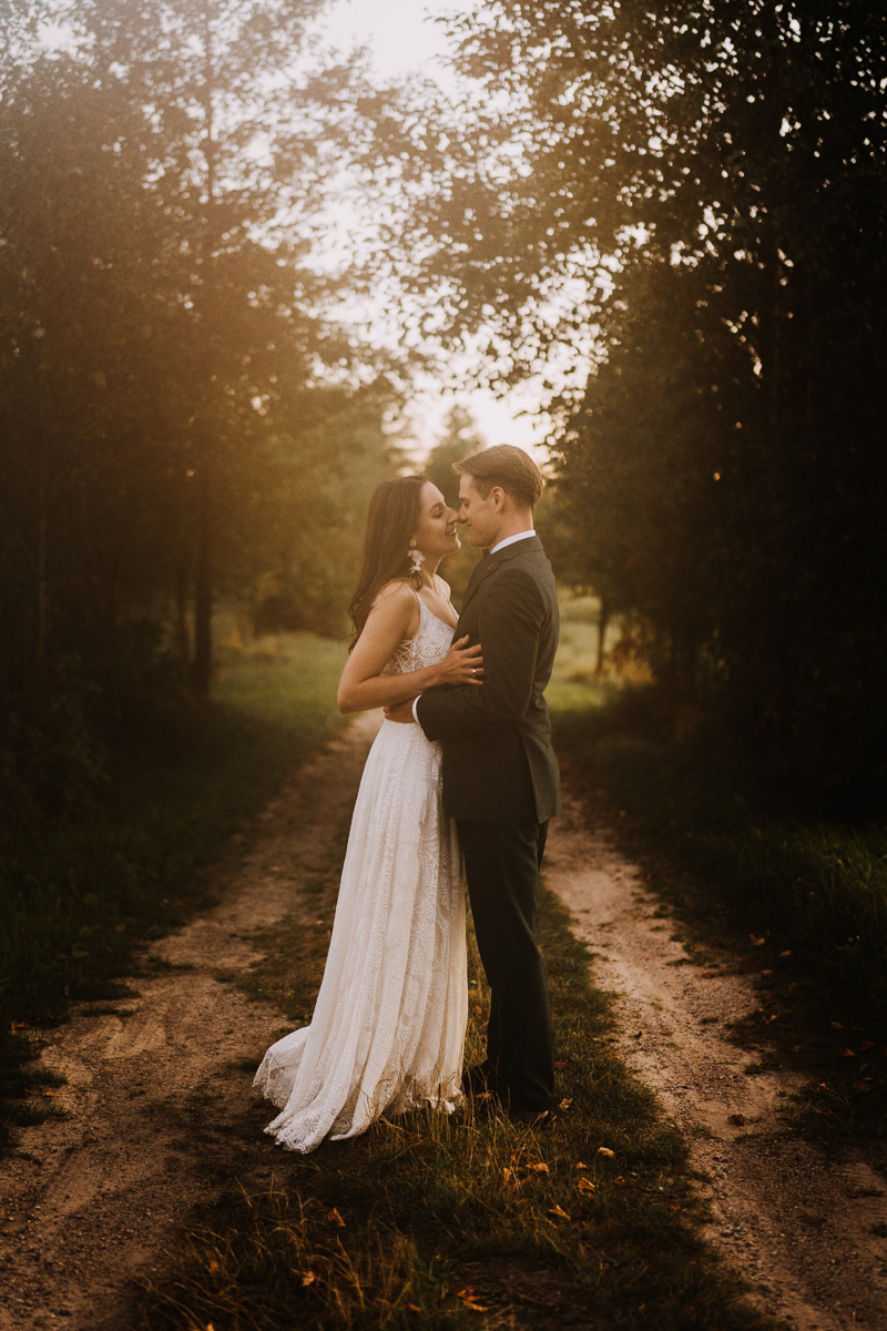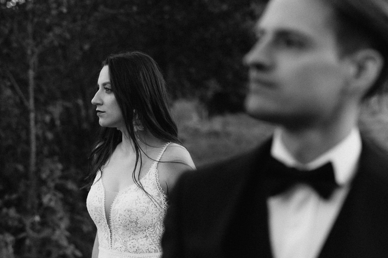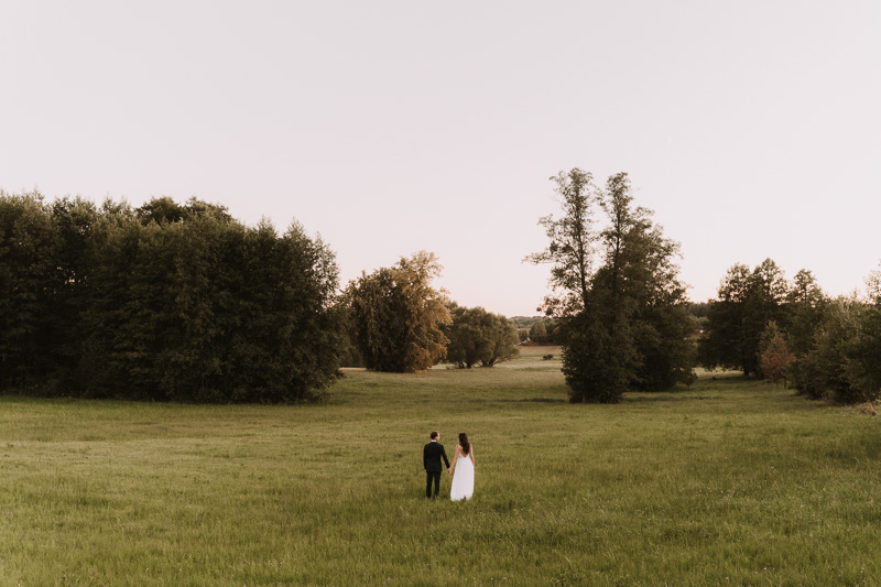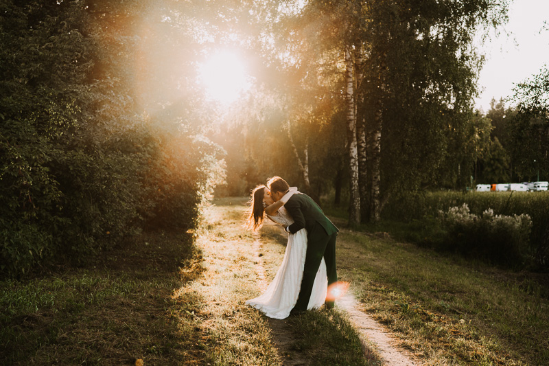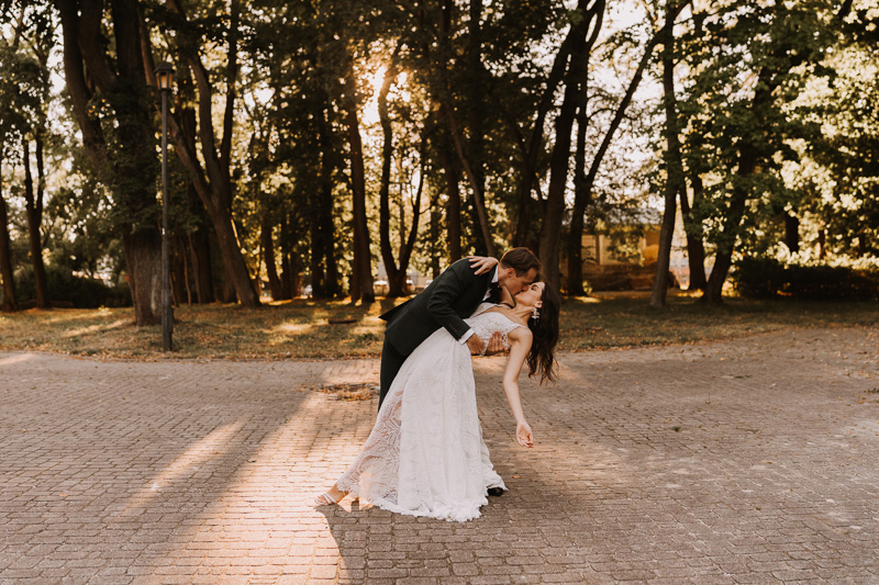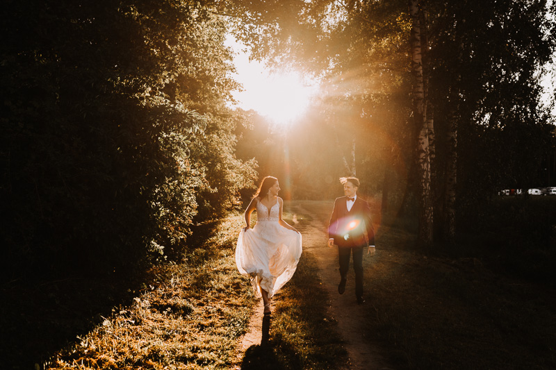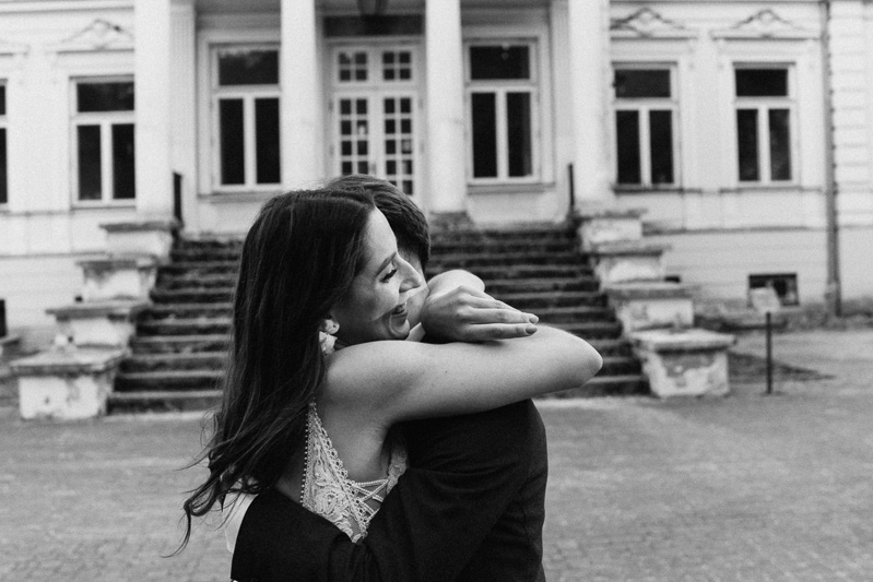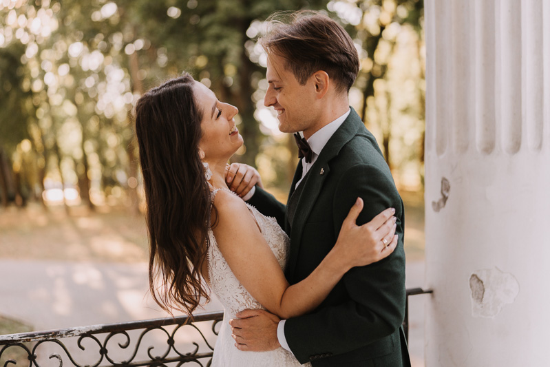 Sesję wykonaliśmy w trzech lokalizacjach; pierwszą z nich było otoczenie Pałacu Lubomirskich w Białymstoku. Pałac, choć piękny, jest niestety zaniedbany, jednak udało się nam wykonać tam bardzo przyjemne kadry i wykorzystać potencjał drzemiący w tym miejscu. Bardzo lubię wplatać w sesje ślubne architekturę – dzięki temu kadry są bardziej różnorodne i świetnie uzupełniają się z lokalizacjami wśród natury.