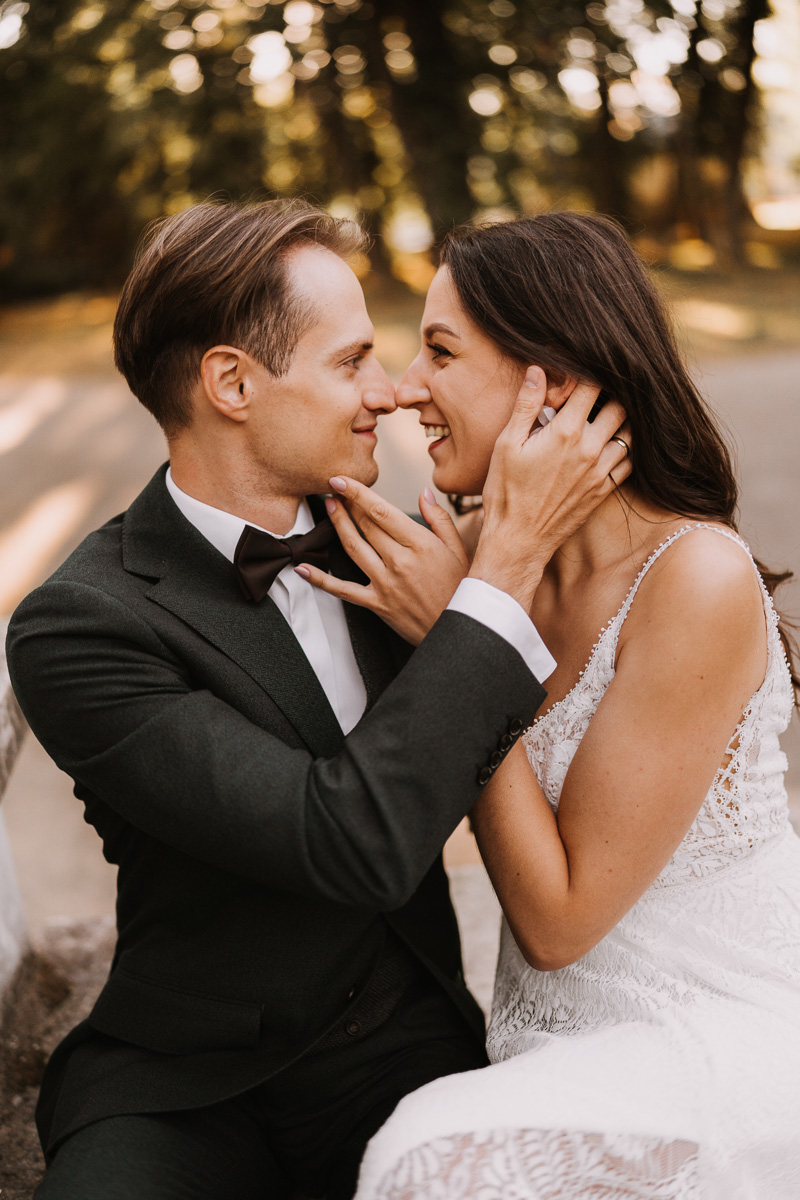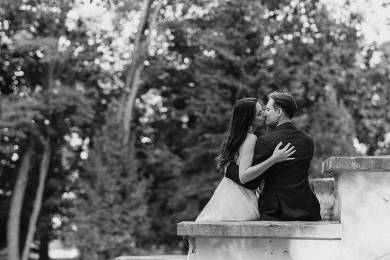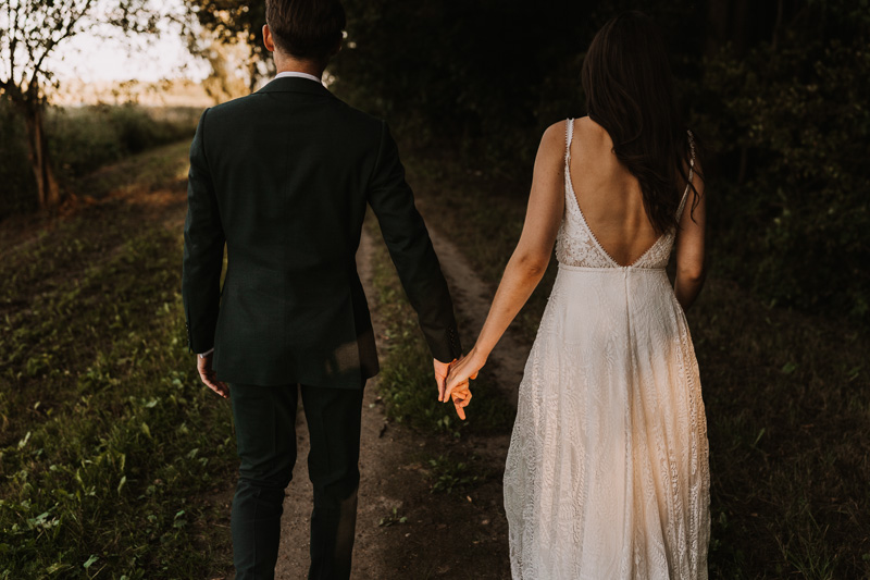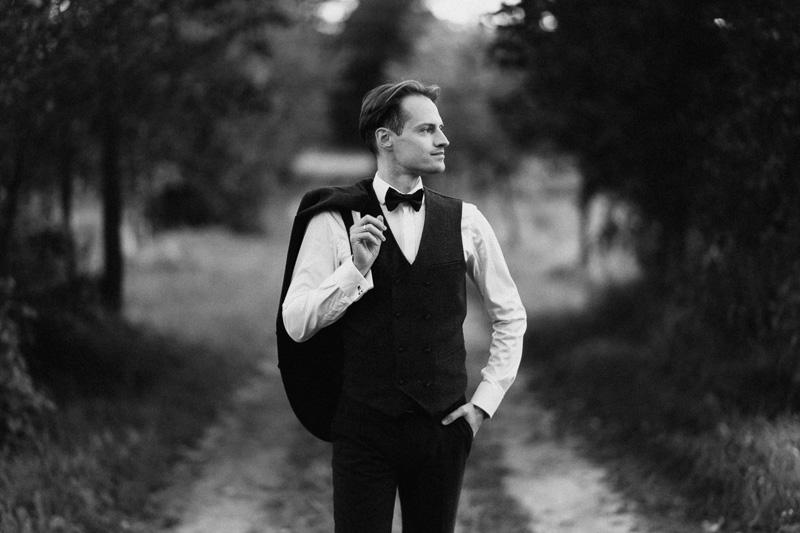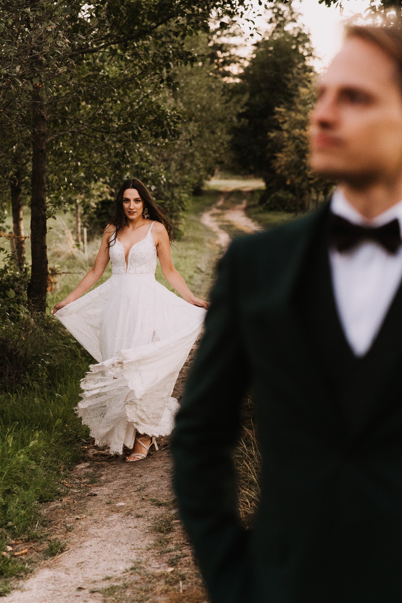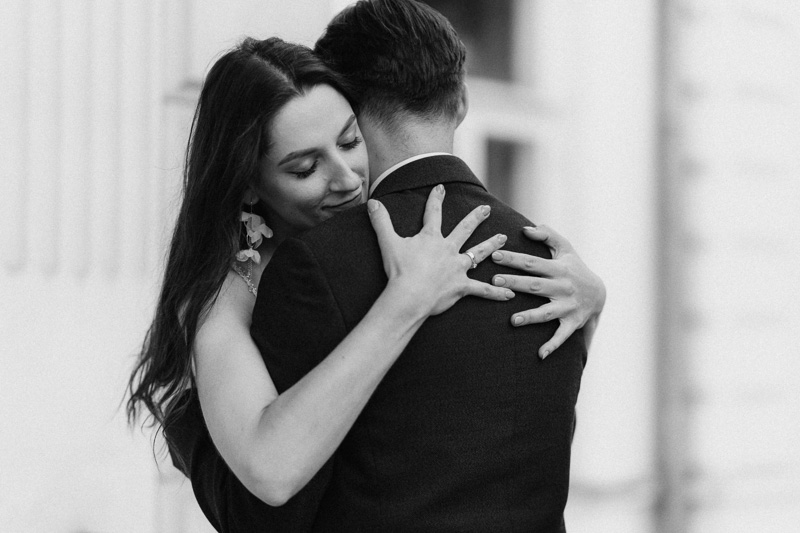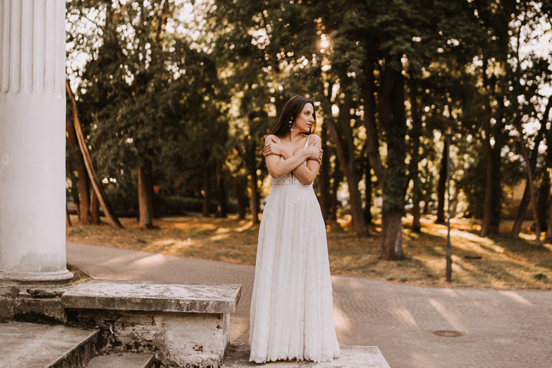 Sesję wykonaliśmy w trzech lokalizacjach; pierwszą z nich było otoczenie Pałacu Lubomirskich w Białymstoku. Pałac, choć piękny, jest niestety zaniedbany, jednak udało się nam wykonać tam bardzo przyjemne kadry i wykorzystać potencjał drzemiący w tym miejscu. Bardzo lubię wplatać w sesje ślubne architekturę – dzięki temu kadry są bardziej różnorodne i świetnie uzupełniają się z lokalizacjami wśród natury.
